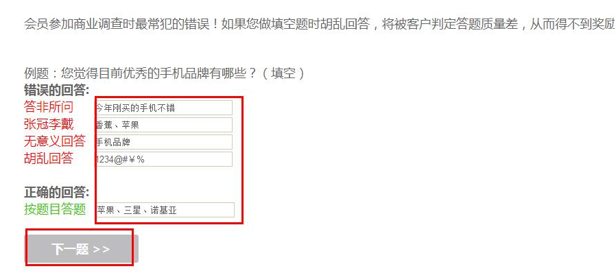 1.会员参加商业调查时最常犯的错误!如果您做填空题时胡乱回答,将被客户判定答题质量差,从而得不到奖励。
