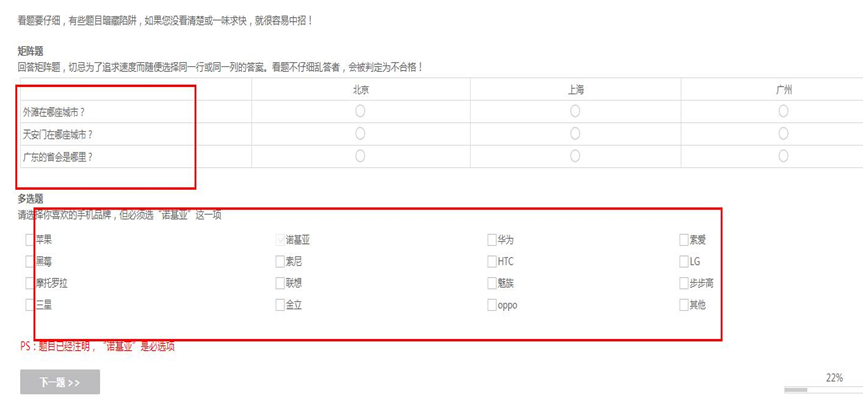 回答矩阵题,切忌为了追求速度而随便选择同一行或同一列的答案。看题不仔细乱答者,会被判定为不合格!